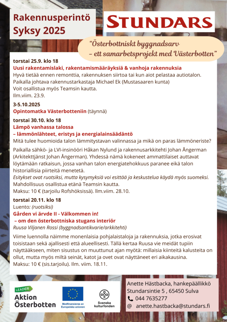 Vuosina 2020-2022 Stundars yhdessä Kosolan talo Oy:n, Pietarsaaren museon ja Carlsron museon kanssa toteutti Leader kehittämishankkeen ”Komeat pohjalaiset talot”. Hankkeen nettisivuilta löydät tietoa hankkeesta, ohjeita rakennusten kunnostamiseen ja ylläpitoon, perinteisen rakentamisen taitajia ja vinkkejä matkailuun.
