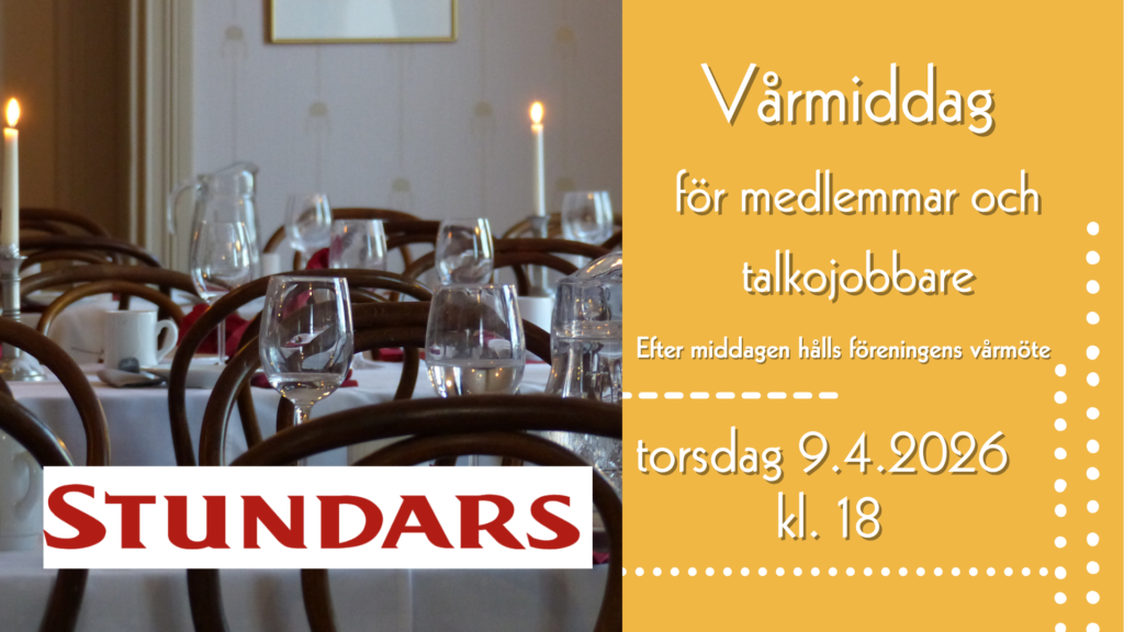 Stundars rf välkomnar alla talkojobbare och medlemmar till en vårmiddag torsdag 9 april kl. 18 i Restaurang Hemmer.