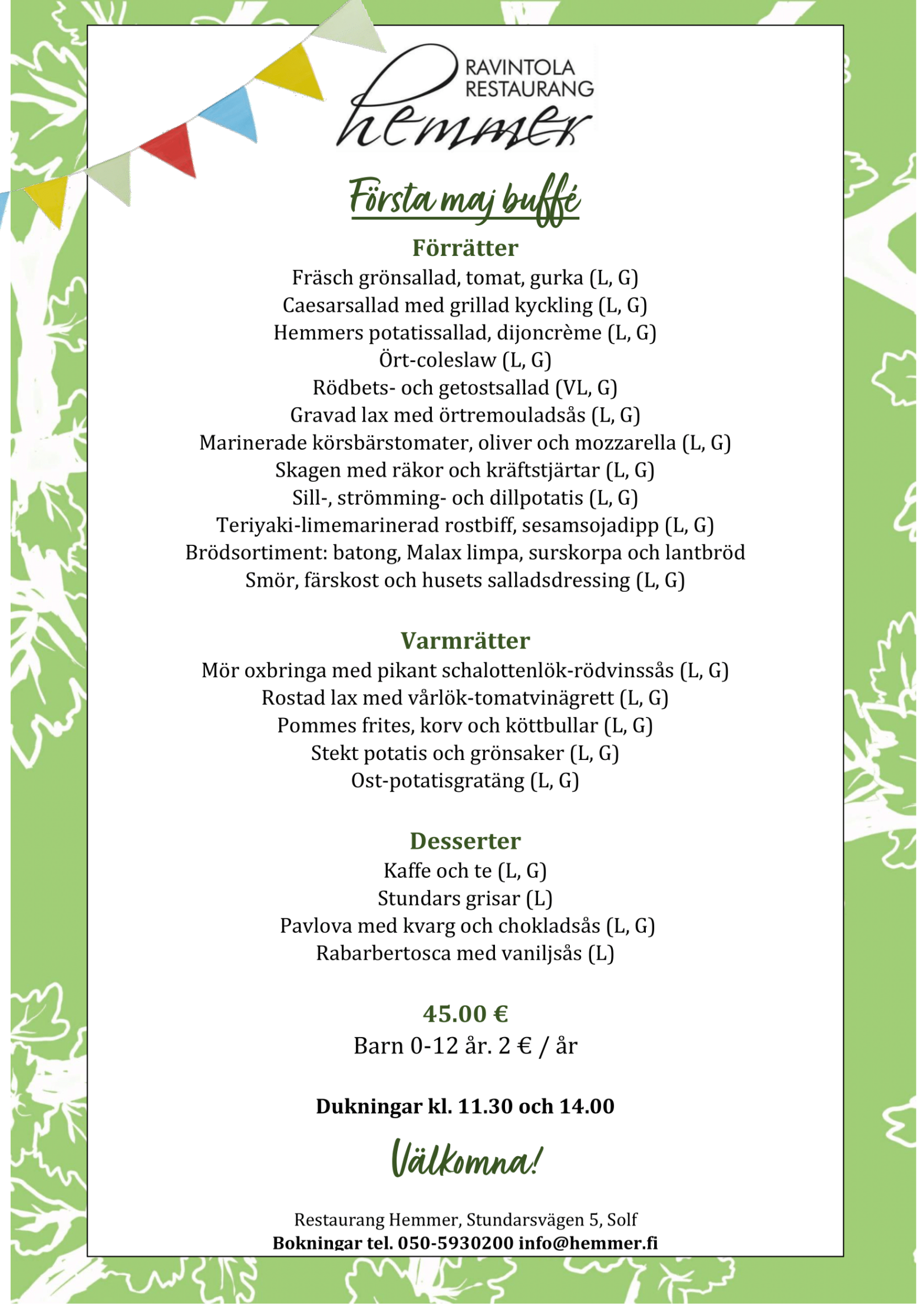 Under Stundars förstamajfest serveras samtidigt en lunchbuffét i Restaurang Hemmer, med bokning på förhand via telefonnumret 050–5930200 eller per e-post info@hemmer.fi.